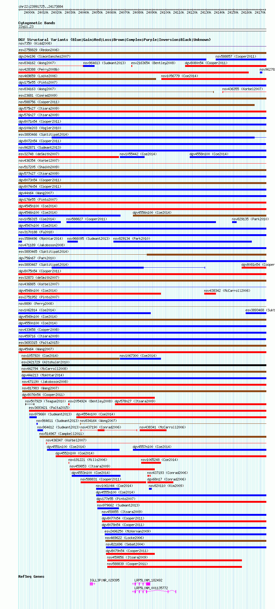 Variant DetailsVariant: nsv588777| Internal ID | 16376186 | | Landmark | | | Location Information | | | Cytoband | 22q11.23 | | Allele length | | Assembly | Allele length | | hg38 | 182160 | | hg19 | 182160 | | hg18 | 182160 |