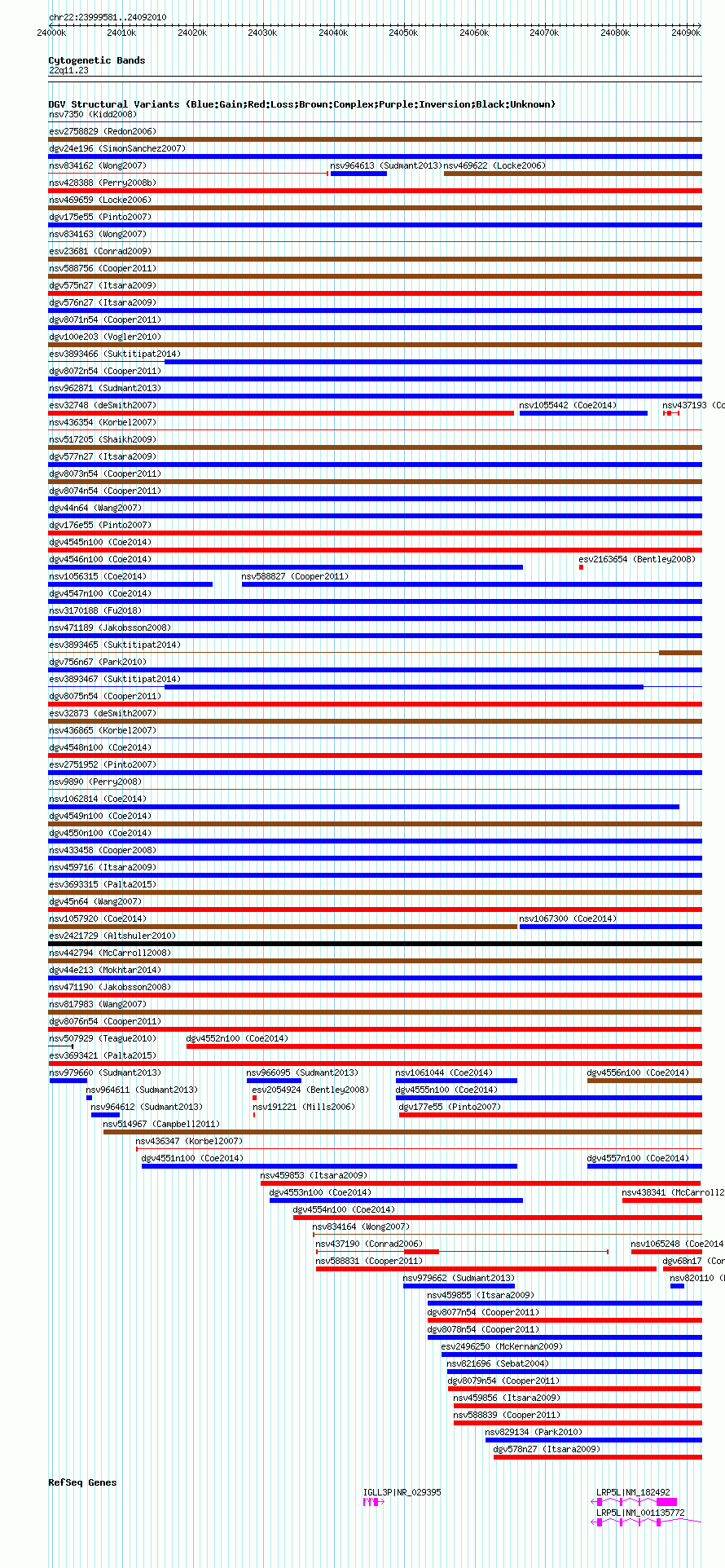Variant DetailsVariant: nsv588814| Internal ID | 16376223 | | Landmark | | | Location Information | | | Cytoband | 22q11.23 | | Allele length | | Assembly | Allele length | | hg38 | 92430 | | hg19 | 92430 | | hg18 | 92430 |