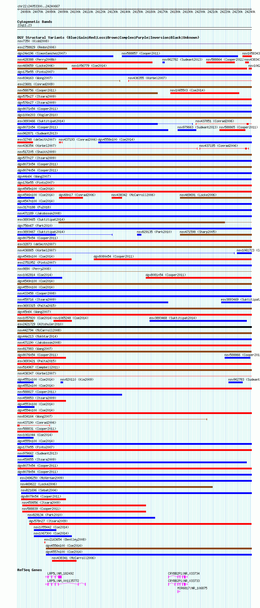 Variant DetailsVariant: nsv588836| Internal ID | 16376245 | | Landmark | | | Location Information | | | Cytoband | 22q11.23 | | Allele length | | Assembly | Allele length | | hg38 | 187368 | | hg19 | 187368 | | hg18 | 187368 |