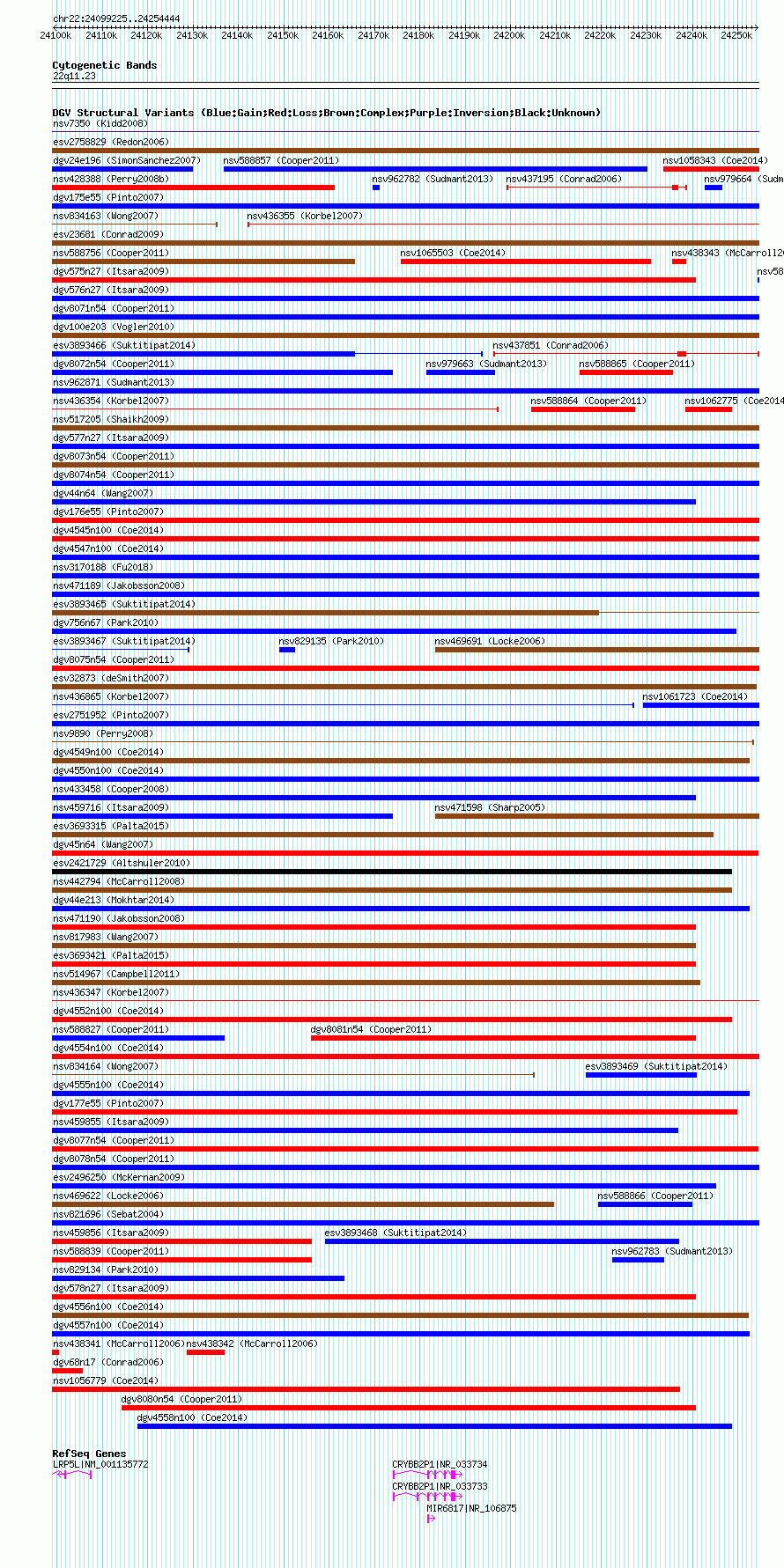 Variant DetailsVariant: nsv588850| Internal ID | 16376259 | | Landmark | | | Location Information | | | Cytoband | 22q11.23 | | Allele length | | Assembly | Allele length | | hg38 | 155220 | | hg19 | 155220 | | hg18 | 155220 |