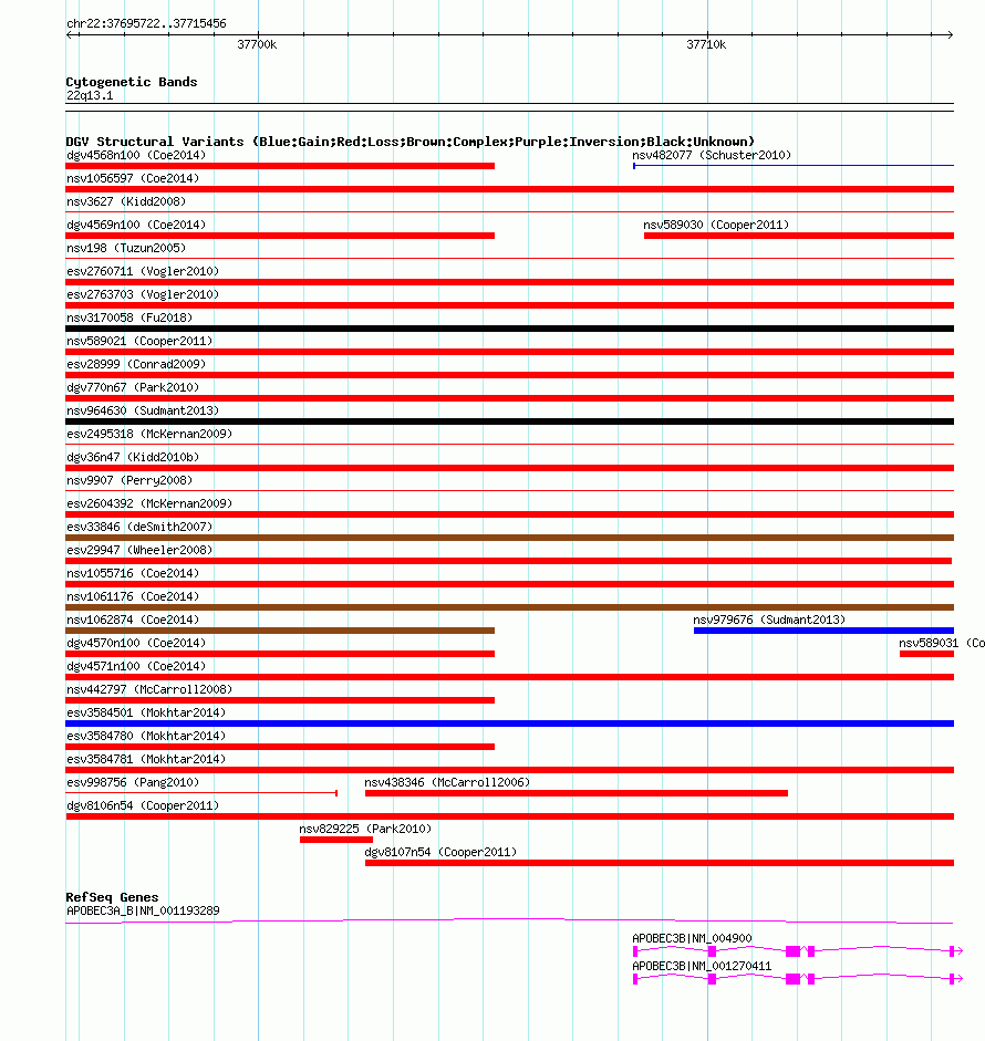 Variant DetailsVariant: nsv589024| Internal ID | 16376433 | | Landmark | | | Location Information | | | Cytoband | 22q13.1 | | Allele length | | Assembly | Allele length | | hg38 | 19735 | | hg19 | 19735 | | hg18 | 19735 |