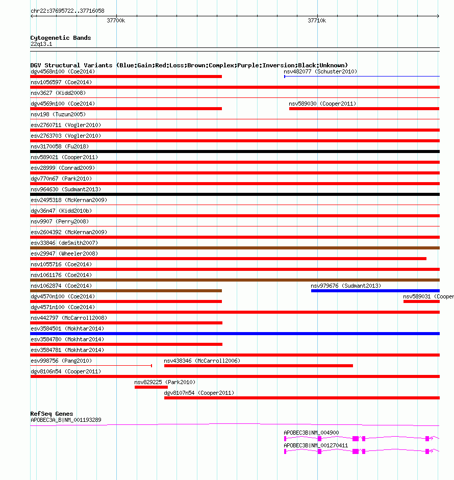 Variant DetailsVariant: nsv589025| Internal ID | 16376434 | | Landmark | | | Location Information | | | Cytoband | 22q13.1 | | Allele length | | Assembly | Allele length | | hg38 | 20337 | | hg19 | 20337 | | hg18 | 20337 |
