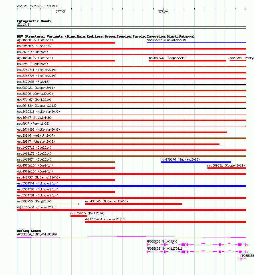 Variant DetailsVariant: nsv589026| Internal ID | 16376435 | | Landmark | | | Location Information | | | Cytoband | 22q13.1 | | Allele length | | Assembly | Allele length | | hg38 | 22271 | | hg19 | 22271 | | hg18 | 22271 |