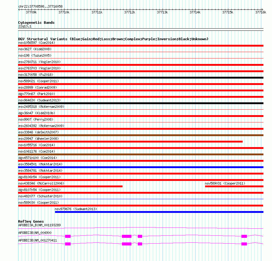 | | Variant Type | CNV loss | | Copy Number | | | Allele State | | | Allele Origin | | | Probe Count | | | Validation Flag | | | Merged Status | M | | Merged Variants | | | Supporting Variants | nssv957061 | | Samples | | | Known Genes | APOBEC3A_B, APOBEC3B | | Method | SNP array | | Analysis | Illumina SNP array copy number analysis | | Platform | Not reported | | Comments | | | Reference | Cooper_et_al_2011 | | Pubmed ID | 21841781 | | Accession Number(s) | nsv589030