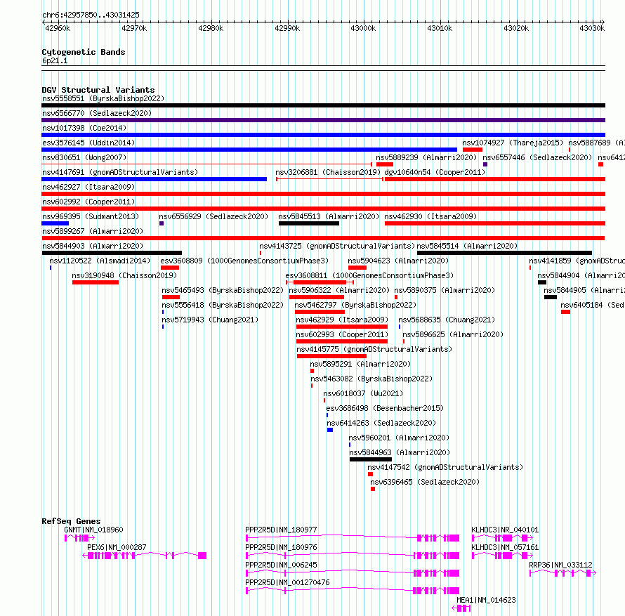 | | Variant Type | CNV deletion | | Copy Number | | | Allele State | | | Allele Origin | | | Probe Count | | | Validation Flag | | | Merged Status | M | | Merged Variants | | | Supporting Variants | nssv17449358 | | Samples | | | Known Genes | GNMT, KLHDC3, MEA1, PEX6, PPP2R5D, RRP36 | | Method | Sequencing | | Analysis | | | Platform | | | Comments | | | Reference | Almarri_et_al_2020 | | Pubmed ID | 32531199 | | Accession Number(s) | nsv5899267