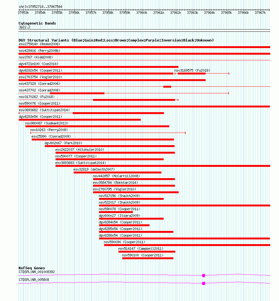 Variant DetailsVariant: nsv590076| Internal ID | 16377485 | | Landmark | | | Location Information | | | Cytoband | 3p22.2 | | Allele length | | Assembly | Allele length | | hg38 | 14827 | | hg19 | 14827 | | hg18 | 14827 |