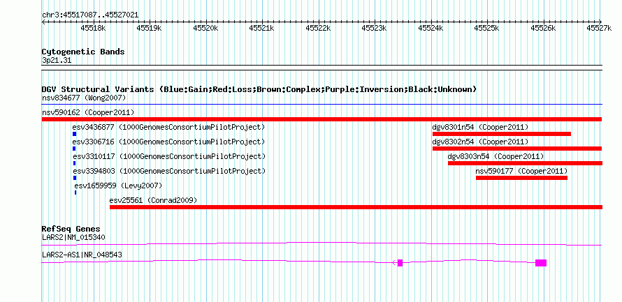Variant DetailsVariant: nsv590162| Internal ID | 16377571 | | Landmark | | | Location Information | | | Cytoband | 3p21.31 | | Allele length | | Assembly | Allele length | | hg38 | 9935 | | hg19 | 9935 | | hg18 | 9935 |