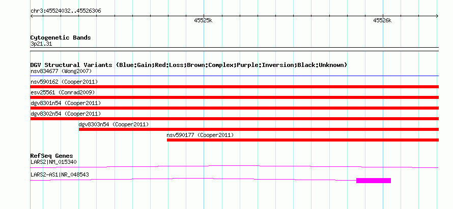 | | Variant Type | CNV loss | | Copy Number | | | Allele State | | | Allele Origin | | | Probe Count | | | Validation Flag | | | Merged Status | M | | Merged Variants | dgv8301n54 | | Supporting Variants | nssv962453, nssv962454 | | Samples | | | Known Genes | LARS2, LARS2-AS1 | | Method | SNP array | | Analysis | Illumina SNP array copy number analysis | | Platform | Not reported | | Comments | | | Reference | Cooper_et_al_2011 | | Pubmed ID | 21841781 | | Accession Number(s) | nsv590163