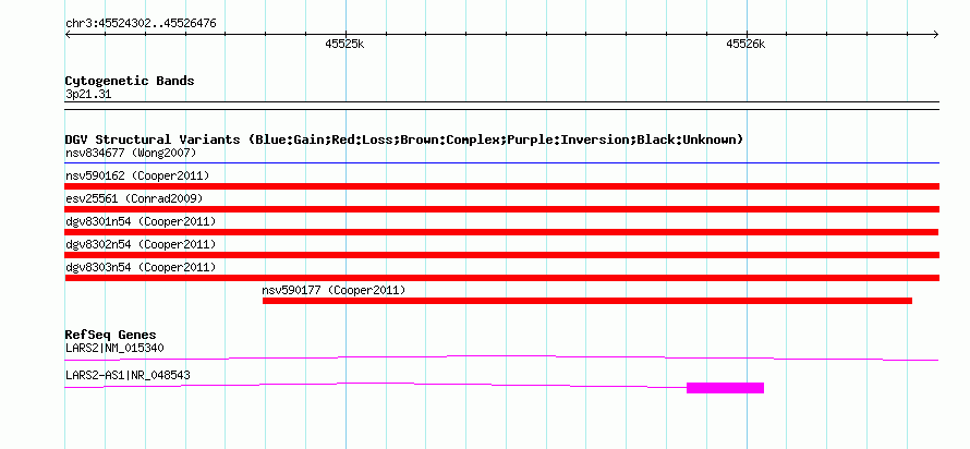 | | Variant Type | CNV loss | | Copy Number | | | Allele State | | | Allele Origin | | | Probe Count | | | Validation Flag | | | Merged Status | M | | Merged Variants | dgv8301n54 | | Supporting Variants | nssv962466 | | Samples | | | Known Genes | LARS2, LARS2-AS1 | | Method | SNP array | | Analysis | Illumina SNP array copy number analysis | | Platform | Not reported | | Comments | | | Reference | Cooper_et_al_2011 | | Pubmed ID | 21841781 | | Accession Number(s) | nsv590167