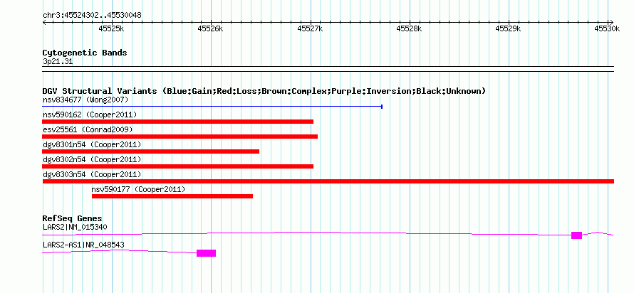 | | Variant Type | CNV loss | | Copy Number | | | Allele State | | | Allele Origin | | | Probe Count | | | Validation Flag | | | Merged Status | M | | Merged Variants | dgv8303n54 | | Supporting Variants | nssv962472 | | Samples | | | Known Genes | LARS2, LARS2-AS1 | | Method | SNP array | | Analysis | Illumina SNP array copy number analysis | | Platform | Not reported | | Comments | | | Reference | Cooper_et_al_2011 | | Pubmed ID | 21841781 | | Accession Number(s) | nsv590169