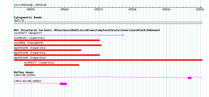 Variant DetailsVariant: nsv590174| Internal ID | 16377583 | | Landmark | | | Location Information | | | Cytoband | 3p21.31 | | Allele length | | Assembly | Allele length | | hg38 | 5551 | | hg19 | 5551 | | hg18 | 5551 |