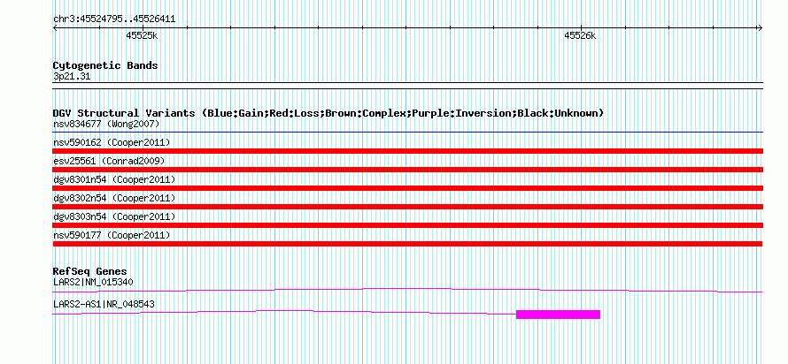 | | Variant Type | CNV loss | | Copy Number | | | Allele State | | | Allele Origin | | | Probe Count | | | Validation Flag | | | Merged Status | M | | Merged Variants | | | Supporting Variants | nssv962482 | | Samples | | | Known Genes | LARS2, LARS2-AS1 | | Method | SNP array | | Analysis | Illumina SNP array copy number analysis | | Platform | Not reported | | Comments | | | Reference | Cooper_et_al_2011 | | Pubmed ID | 21841781 | | Accession Number(s) | nsv590177