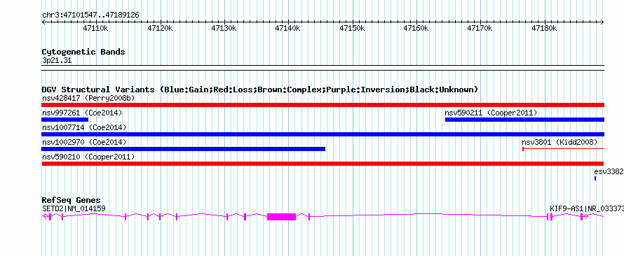 Variant DetailsVariant: nsv590210| Internal ID | 16377619 | | Landmark | | | Location Information | | | Cytoband | 3p21.31 | | Allele length | | Assembly | Allele length | | hg38 | 87580 | | hg19 | 87580 | | hg18 | 87580 |