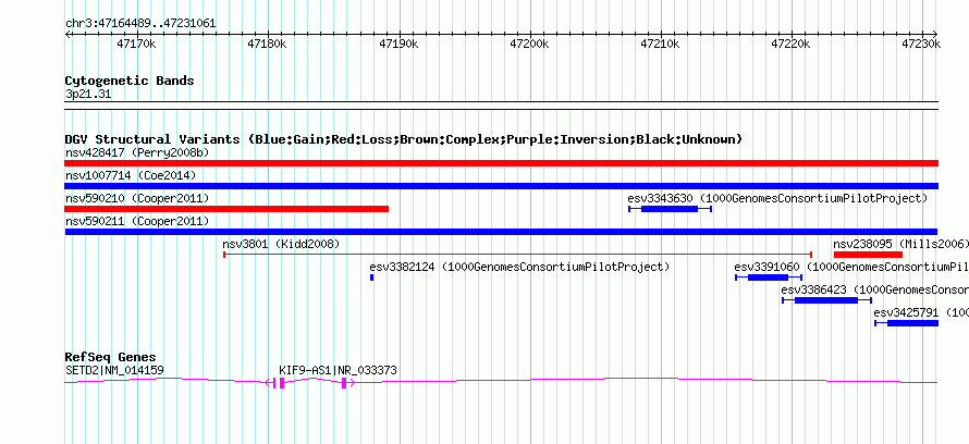 Variant DetailsVariant: nsv590211| Internal ID | 16377620 | | Landmark | | | Location Information | | | Cytoband | 3p21.31 | | Allele length | | Assembly | Allele length | | hg38 | 66573 | | hg19 | 66573 | | hg18 | 66573 |