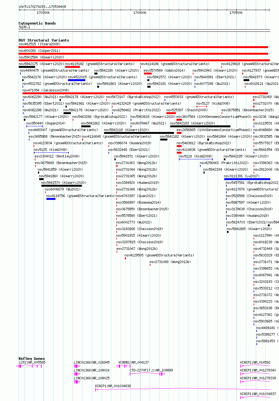 Variant DetailsVariant: nsv5902584| Internal ID | 22677744 | | Landmark | | | Location Information | | | Cytoband | 5q35.1 | | Allele length | | Assembly | Allele length | | hg38 | 260116 | | hg19 | 260116 |