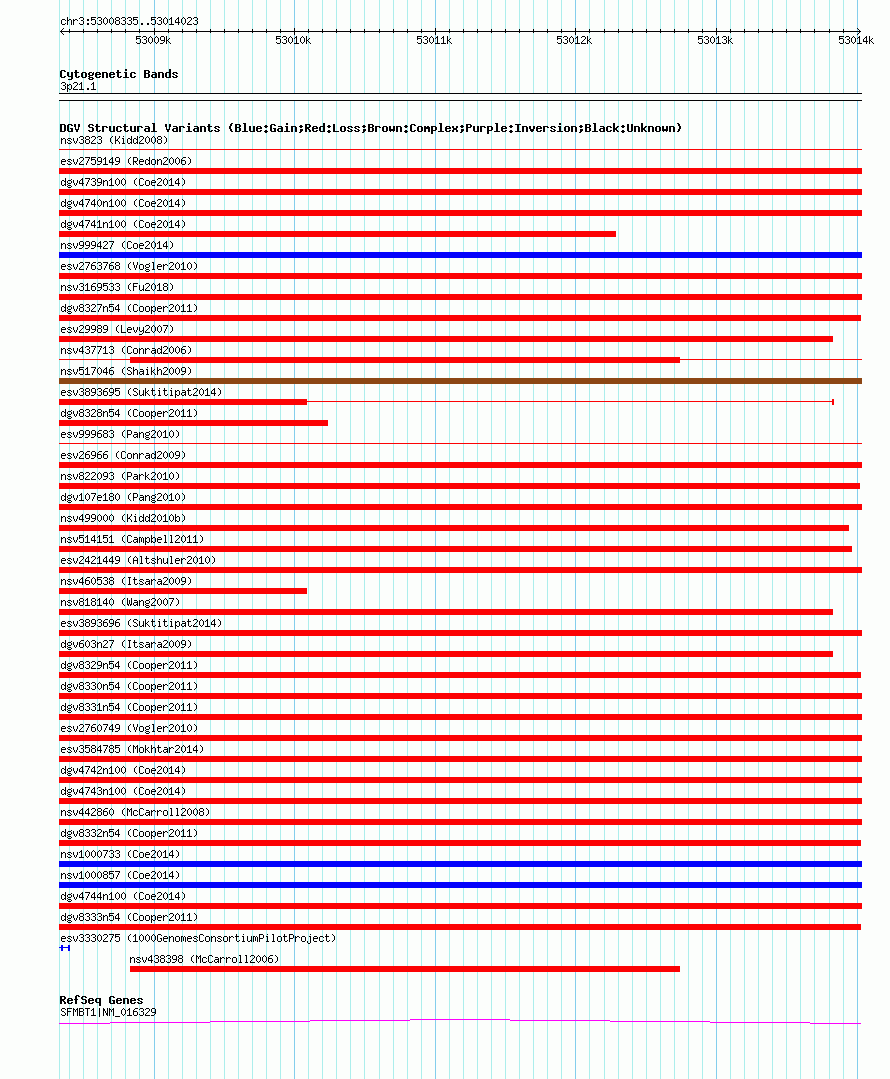 Variant DetailsVariant: nsv590338| Internal ID | 16377747 | | Landmark | | | Location Information | | | Cytoband | 3p21.1 | | Allele length | | Assembly | Allele length | | hg38 | 5689 | | hg19 | 5689 | | hg18 | 5689 |