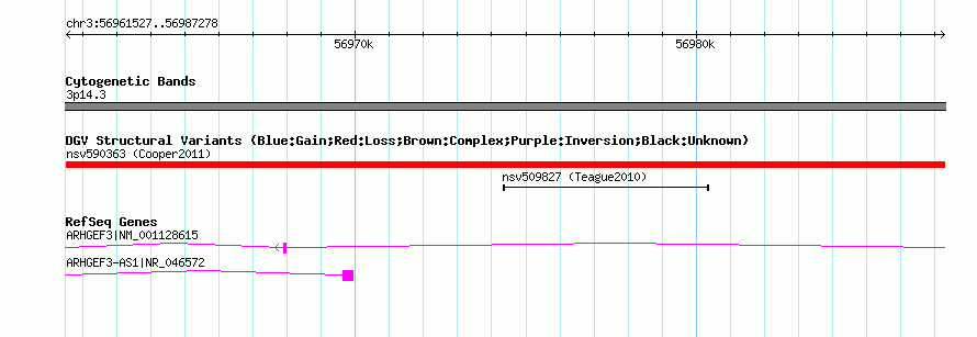 Variant DetailsVariant: nsv590363| Internal ID | 16377772 | | Landmark | | | Location Information | | | Cytoband | 3p14.3 | | Allele length | | Assembly | Allele length | | hg38 | 25752 | | hg19 | 25752 | | hg18 | 25752 |
