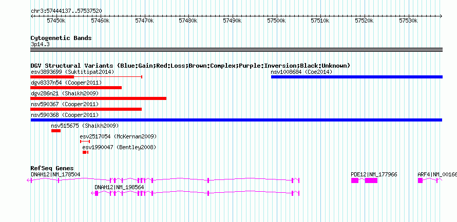 | | Variant Type | CNV gain | | Copy Number | | | Allele State | | | Allele Origin | | | Probe Count | | | Validation Flag | | | Merged Status | M | | Merged Variants | | | Supporting Variants | nssv963367 | | Samples | | | Known Genes | ARF4, DNAH12, PDE12 | | Method | SNP array | | Analysis | Illumina SNP array copy number analysis | | Platform | Not reported | | Comments | | | Reference | Cooper_et_al_2011 | | Pubmed ID | 21841781 | | Accession Number(s) | nsv590368
