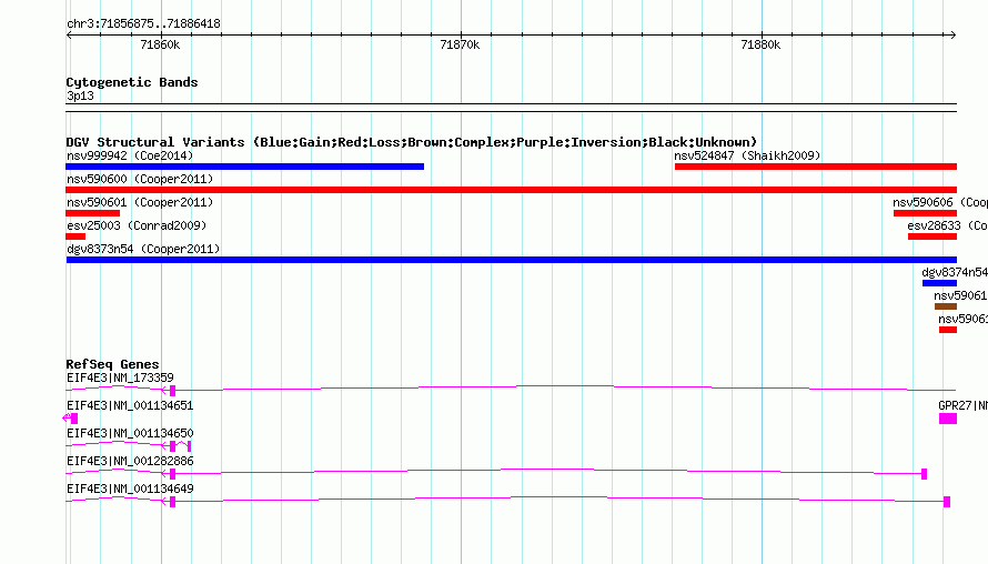 |  | Variant Type | CNV gain |  | Copy Number |  |  | Allele State |  |  | Allele Origin |  |  | Probe Count |  |  | Validation Flag |  |  | Merged Status | M |  | Merged Variants | dgv8373n54 |  | Supporting Variants | nssv965544 |  | Samples |  |  | Known Genes | EIF4E3, GPR27 |  | Method | SNP array |  | Analysis | Illumina SNP array copy number analysis |  | Platform | Not reported |  | Comments |  |  | Reference | Cooper_et_al_2011 |  | Pubmed ID | 21841781 |  | Accession Number(s) | nsv590602
