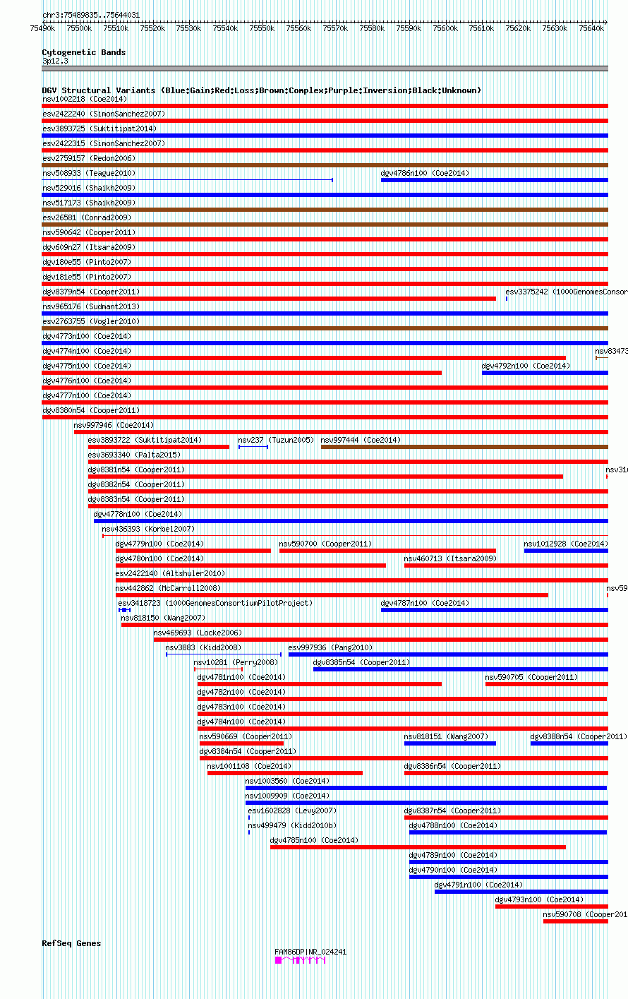 Variant DetailsVariant: nsv590645| Internal ID | 16378054 | | Landmark | | | Location Information | | | Cytoband | 3p12.3 | | Allele length | | Assembly | Allele length | | hg38 | 154197 | | hg19 | 154197 | | hg18 | 154197 |