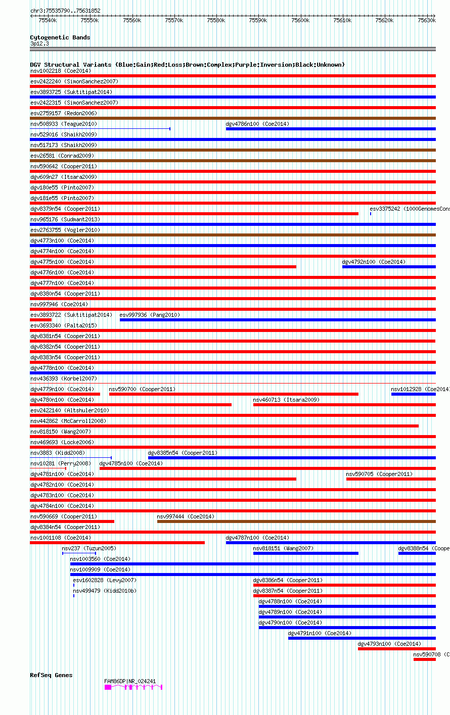 Variant DetailsVariant: nsv590681| Internal ID | 16378090 | | Landmark | | | Location Information | | | Cytoband | 3p12.3 | | Allele length | | Assembly | Allele length | | hg38 | 96063 | | hg19 | 96063 | | hg18 | 96063 |