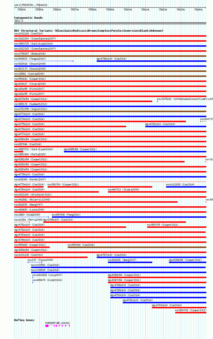 Variant DetailsVariant: nsv590682| Internal ID | 16378091 | | Landmark | | | Location Information | | | Cytoband | 3p12.3 | | Allele length | | Assembly | Allele length | | hg38 | 108242 | | hg19 | 108242 | | hg18 | 108242 |