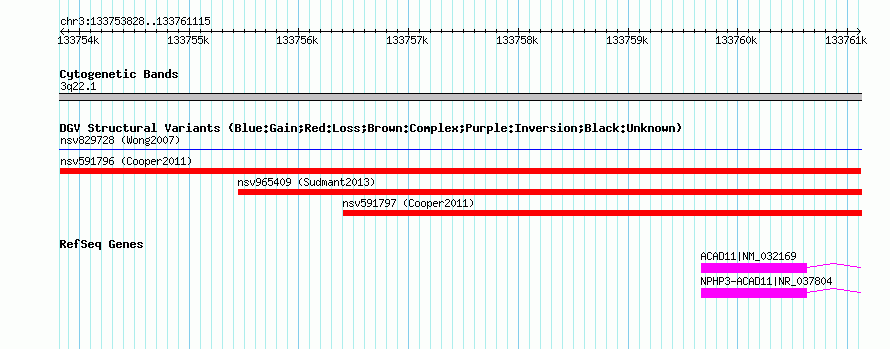 | | Variant Type | CNV loss | | Copy Number | | | Allele State | | | Allele Origin | | | Probe Count | | | Validation Flag | | | Merged Status | M | | Merged Variants | | | Supporting Variants | nssv974188 | | Samples | | | Known Genes | ACAD11, NPHP3-ACAD11 | | Method | SNP array | | Analysis | Illumina SNP array copy number analysis | | Platform | Not reported | | Comments | | | Reference | Cooper_et_al_2011 | | Pubmed ID | 21841781 | | Accession Number(s) | nsv591796