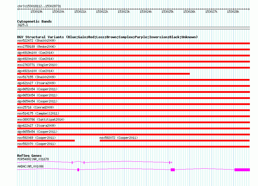 | | Variant Type | CNV loss | | Copy Number | | | Allele State | | | Allele Origin | | | Probe Count | | | Validation Flag | | | Merged Status | M | | Merged Variants | | | Supporting Variants | nssv976845, nssv976847, nssv976846 | | Samples | | | Known Genes | AADAC, MIR548H2 | | Method | SNP array | | Analysis | Illumina SNP array copy number analysis | | Platform | Not reported | | Comments | | | Reference | Cooper_et_al_2011 | | Pubmed ID | 21841781 | | Accession Number(s) | nsv592070