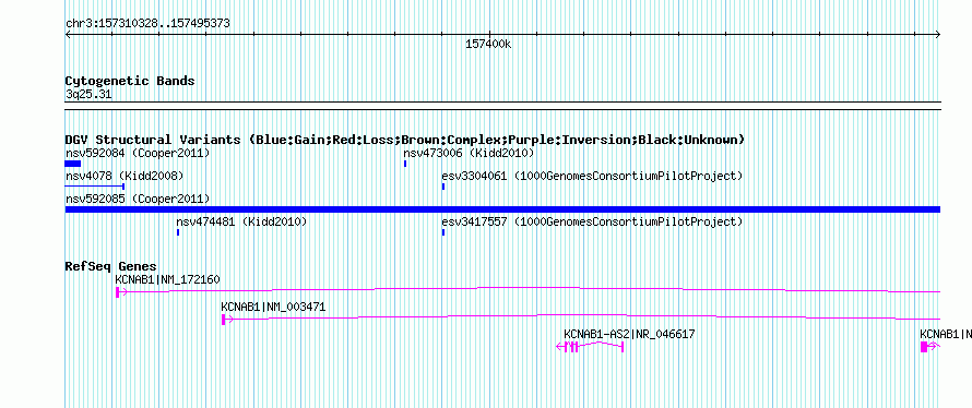 Variant DetailsVariant: nsv592085| Internal ID | 16379494 | | Landmark | | | Location Information | | | Cytoband | 3q25.31 | | Allele length | | Assembly | Allele length | | hg38 | 185046 | | hg19 | 185046 | | hg18 | 185046 |