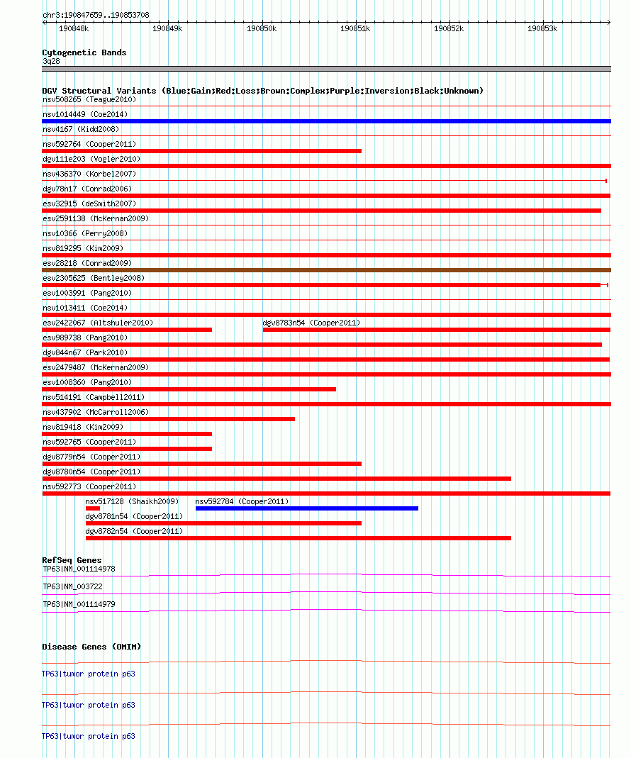 | | Variant Type | CNV loss | | Copy Number | | | Allele State | | | Allele Origin | | | Probe Count | | | Validation Flag | | | Merged Status | M | | Merged Variants | | | Supporting Variants | nssv982992, nssv982991 | | Samples | | | Known Genes | TP63 | | Method | SNP array | | Analysis | Illumina SNP array copy number analysis | | Platform | Not reported | | Comments | | | Reference | Cooper_et_al_2011 | | Pubmed ID | 21841781 | | Accession Number(s) | nsv592773