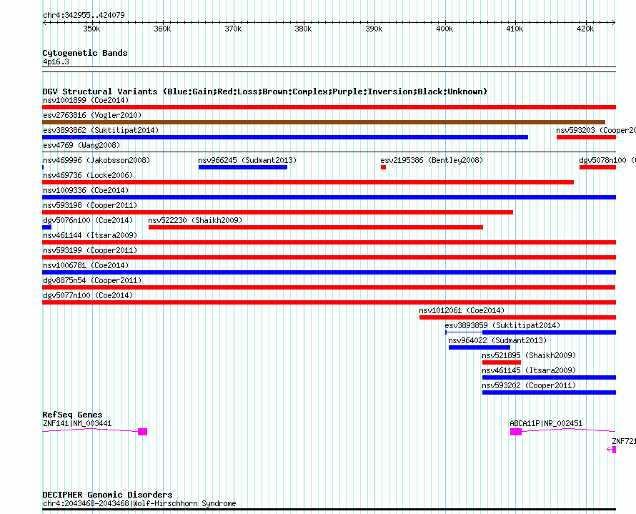 Variant DetailsVariant: nsv593201| Internal ID | 16380610 | | Landmark | | | Location Information | | | Cytoband | 4p16.3 | | Allele length | | Assembly | Allele length | | hg38 | 81125 | | hg19 | 81125 | | hg18 | 81125 |