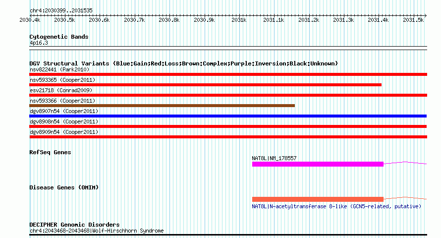 | | Variant Type | CNV loss | | Copy Number | | | Allele State | | | Allele Origin | | | Probe Count | | | Validation Flag | | | Merged Status | M | | Merged Variants | dgv8908n54 | | Supporting Variants | nssv988525, nssv988526 | | Samples | | | Known Genes | NAT8L | | Method | SNP array | | Analysis | Illumina SNP array copy number analysis | | Platform | Not reported | | Comments | | | Reference | Cooper_et_al_2011 | | Pubmed ID | 21841781 | | Accession Number(s) | nsv593371