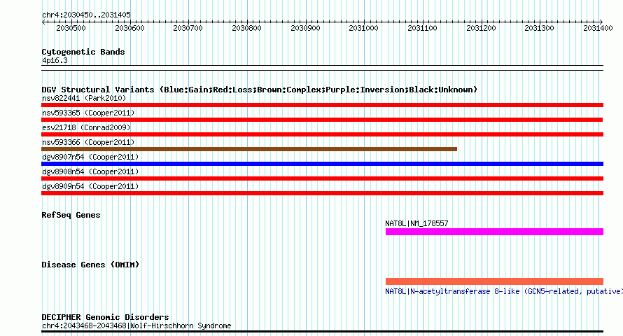| | Variant Type | CNV loss | | Copy Number | | | Allele State | | | Allele Origin | | | Probe Count | | | Validation Flag | | | Merged Status | M | | Merged Variants | dgv8908n54 | | Supporting Variants | nssv988529, nssv988528 | | Samples | | | Known Genes | NAT8L | | Method | SNP array | | Analysis | Illumina SNP array copy number analysis | | Platform | Not reported | | Comments | | | Reference | Cooper_et_al_2011 | | Pubmed ID | 21841781 | | Accession Number(s) | nsv593373