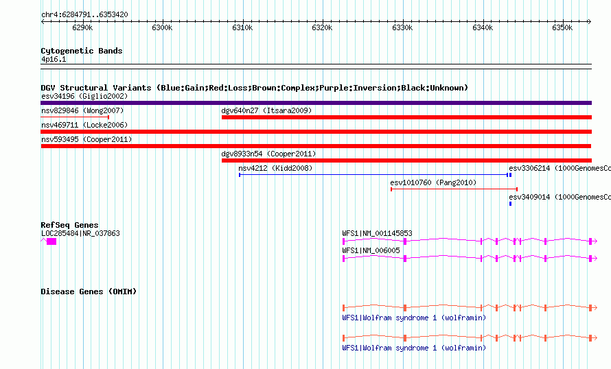 | Variant Type | CNV loss | Copy Number | | Allele State | | Allele Origin | | Probe Count | | Validation Flag | | Merged Status | M | Merged Variants | | Supporting Variants | nssv1152593 | Samples | HGDP00841 | Known Genes | LOC285484, WFS1 | Method | SNP array | Analysis | Illumina SNP array copy number analysis | Platform | Not reported | Comments | | Reference | Cooper_et_al_2011 | Pubmed ID | 21841781 | Accession Number(s) | nsv593495