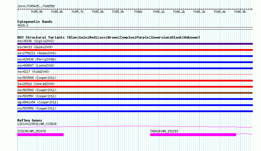 | | Variant Type | CNV gain | | Copy Number | | | Allele State | | | Allele Origin | | | Probe Count | | | Validation Flag | | | Merged Status | M | | Merged Variants | dgv8941n54 | | Supporting Variants | nssv990871, nssv990870 | | Samples | | | Known Genes | CCDC96, LOC100129931, TADA2B | | Method | SNP array | | Analysis | Illumina SNP array copy number analysis | | Platform | Not reported | | Comments | | | Reference | Cooper_et_al_2011 | | Pubmed ID | 21841781 | | Accession Number(s) | nsv593557