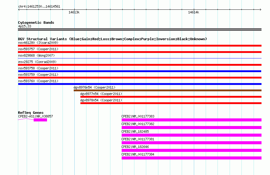 Variant DetailsVariant: nsv593758| Internal ID | 16381167 | | Landmark | | | Location Information | | | Cytoband | 4p15.33 | | Allele length | | Assembly | Allele length | | hg38 | 2032 | | hg19 | 2032 | | hg18 | 2032 |
