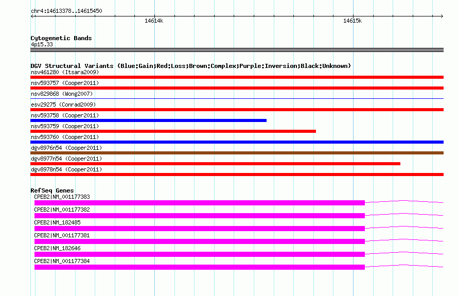 Variant DetailsVariant: nsv593766| Internal ID | 16381175 | | Landmark | | | Location Information | | | Cytoband | 4p15.33 | | Allele length | | Assembly | Allele length | | hg38 | 2073 | | hg19 | 2073 | | hg18 | 2073 |