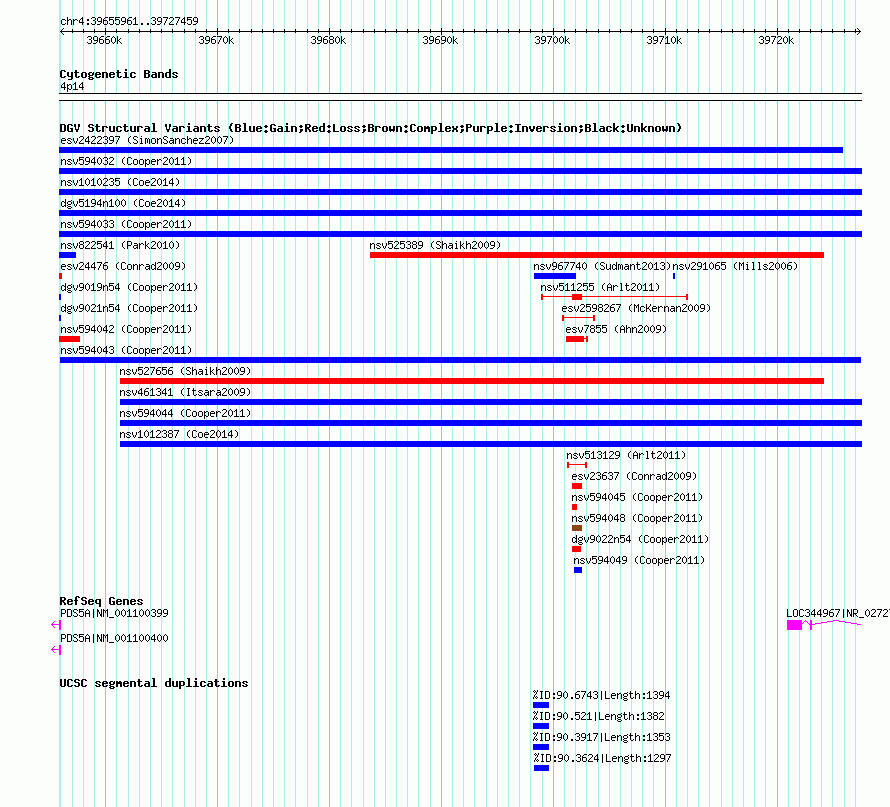 Variant DetailsVariant: nsv594043| Internal ID | 16034766 | | Landmark | | | Location Information | | | Cytoband | 4p14 | | Allele length | | Assembly | Allele length | | hg38 | 71499 | | hg19 | 71499 | | hg18 | 71499 |