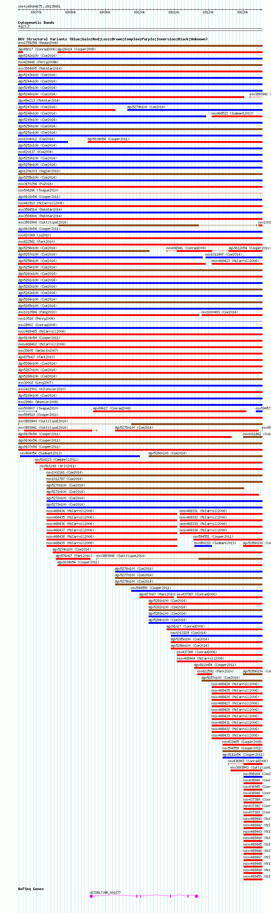 Variant DetailsVariant: nsv594518| Internal ID | 16381927 | | Landmark | | | Location Information | | | Cytoband | 4q13.2 | | Allele length | | Assembly | Allele length | | hg38 | 70817 | | hg19 | 70817 | | hg18 | 70817 |
