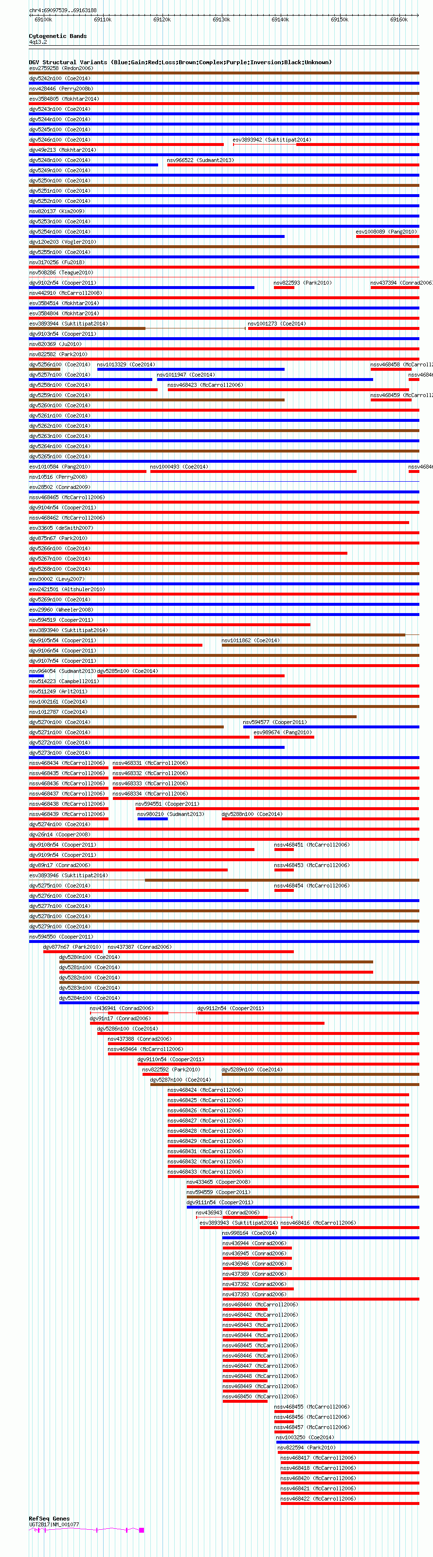 Variant DetailsVariant: nsv594549 | Internal ID | 16381958 | | Landmark | | | Location Information | | | Cytoband | 4q13.2 | | Allele length | | Assembly | Allele length | | hg38 | 65650 | | hg19 | 65650 | | hg18 | 65650 |