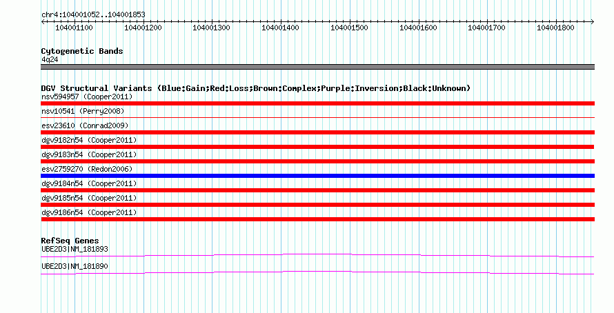 | | Variant Type | CNV loss | | Copy Number | | | Allele State | | | Allele Origin | | | Probe Count | | | Validation Flag | | | Merged Status | M | | Merged Variants | dgv9186n54 | | Supporting Variants | nssv1003635, nssv1003634 | | Samples | | | Known Genes | UBE2D3 | | Method | SNP array | | Analysis | Illumina SNP array copy number analysis | | Platform | Not reported | | Comments | | | Reference | Cooper_et_al_2011 | | Pubmed ID | 21841781 | | Accession Number(s) | nsv594970