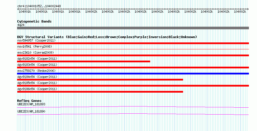 | | Variant Type | CNV loss | | Copy Number | | | Allele State | | | Allele Origin | | | Probe Count | | | Validation Flag | | | Merged Status | M | | Merged Variants | dgv9185n54 | | Supporting Variants | nssv1003636, nssv1003637 | | Samples | | | Known Genes | UBE2D3 | | Method | SNP array | | Analysis | Illumina SNP array copy number analysis | | Platform | Not reported | | Comments | | | Reference | Cooper_et_al_2011 | | Pubmed ID | 21841781 | | Accession Number(s) | nsv594971