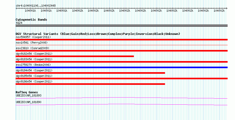 | | Variant Type | CNV loss | | Copy Number | | | Allele State | | | Allele Origin | | | Probe Count | | | Validation Flag | | | Merged Status | M | | Merged Variants | dgv9185n54 | | Supporting Variants | nssv1003642, nssv1003641 | | Samples | | | Known Genes | UBE2D3 | | Method | SNP array | | Analysis | Illumina SNP array copy number analysis | | Platform | Not reported | | Comments | | | Reference | Cooper_et_al_2011 | | Pubmed ID | 21841781 | | Accession Number(s) | nsv594974