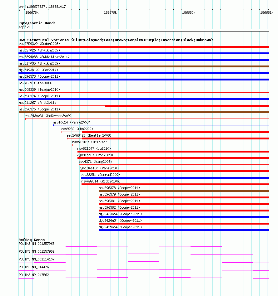 | | Variant Type | CNV gain+loss | | Copy Number | | | Allele State | | | Allele Origin | | | Probe Count | | | Validation Flag | | | Merged Status | M | | Merged Variants | | | Supporting Variants | nssv1017985, nssv1017984 | | Samples | | | Known Genes | PDLIM3 | | Method | SNP array | | Analysis | Illumina SNP array copy number analysis | | Platform | Not reported | | Comments | | | Reference | Cooper_et_al_2011 | | Pubmed ID | 21841781 | | Accession Number(s) | nsv596375