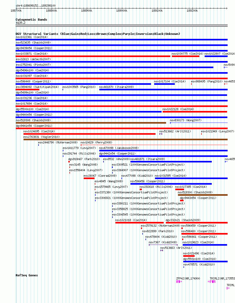 | Variant Type | CNV gain | Copy Number | | Allele State | | Allele Origin | | Probe Count | | Validation Flag | | Merged Status | M | Merged Variants | dgv9440n54 | Supporting Variants | nssv1020488 | Samples | | Known Genes | TRIML1, TRIML2, ZFP42 | Method | SNP array | Analysis | Illumina SNP array copy number analysis | Platform | Not reported | Comments | | Reference | Cooper_et_al_2011 | Pubmed ID | 21841781 | Accession Number(s) | nsv596451