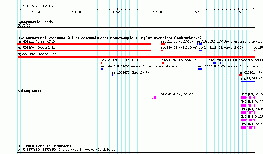 | | Variant Type | CNV loss | | Copy Number | | | Allele State | | | Allele Origin | | | Probe Count | | | Validation Flag | | | Merged Status | M | | Merged Variants | dgv9542n54 | | Supporting Variants | nssv1022208 | | Samples | | | Known Genes | IRX4, LOC101929034 | | Method | SNP array | | Analysis | Illumina SNP array copy number analysis | | Platform | Not reported | | Comments | | | Reference | Cooper_et_al_2011 | | Pubmed ID | 21841781 | | Accession Number(s) | nsv596891
