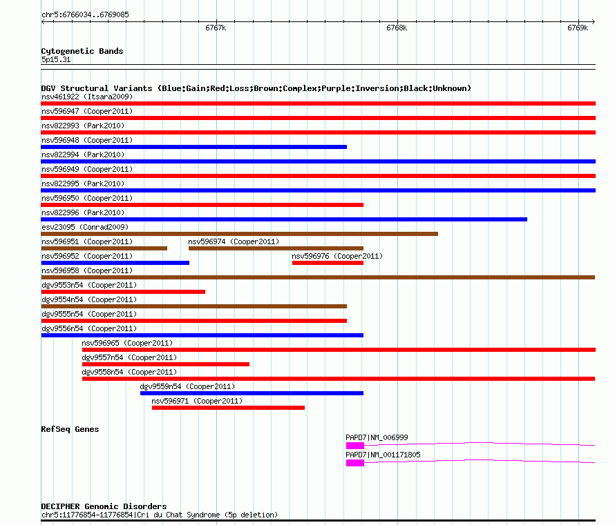 | | Variant Type | CNV gain+loss | | Copy Number | | | Allele State | | | Allele Origin | | | Probe Count | | | Validation Flag | | | Merged Status | M | | Merged Variants | | | Supporting Variants | nssv1023751, nssv1023750 | | Samples | | | Known Genes | PAPD7 | | Method | SNP array | | Analysis | Illumina SNP array copy number analysis | | Platform | Not reported | | Comments | | | Reference | Cooper_et_al_2011 | | Pubmed ID | 21841781 | | Accession Number(s) | nsv596958
