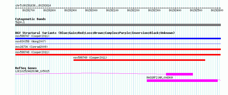 | Variant Type | CNV loss | Copy Number | | Allele State | | Allele Origin | | Probe Count | | Validation Flag | | Merged Status | M | Merged Variants | | Supporting Variants | nssv1035307 | Samples | | Known Genes | LOC102524628, RASGRF2 | Method | SNP array | Analysis | Illumina SNP array copy number analysis | Platform | Not reported | Comments | | Reference | Cooper_et_al_2011 | Pubmed ID | 21841781 | Accession Number(s) | nsv598748