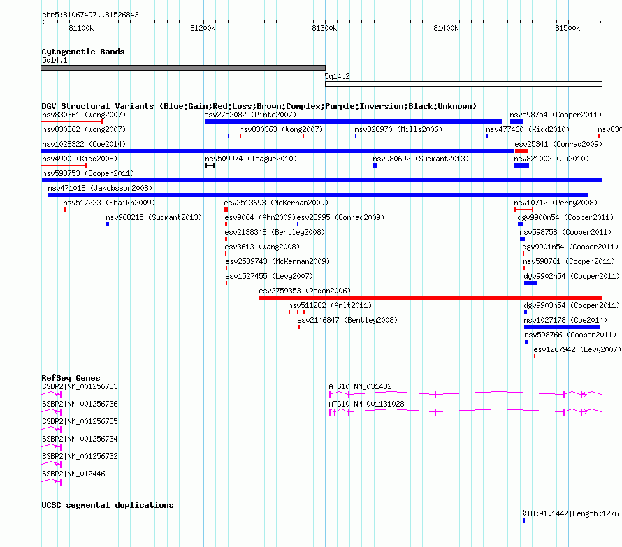 Variant DetailsVariant: nsv598753| Internal ID | 16039476 | | Landmark | | | Location Information | | | Cytoband | 5q14.1 | | Allele length | | Assembly | Allele length | | hg38 | 459347 | | hg19 | 459347 | | hg18 | 459347 |