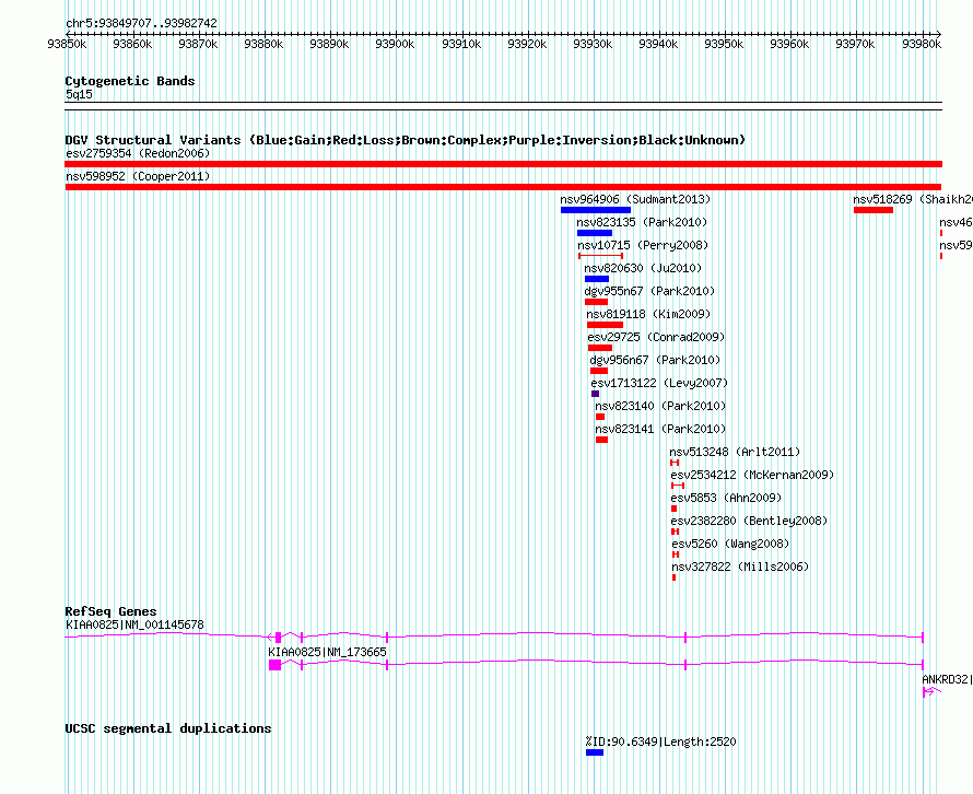 | | Variant Type | CNV loss | | Copy Number | | | Allele State | | | Allele Origin | | | Probe Count | | | Validation Flag | | | Merged Status | M | | Merged Variants | | | Supporting Variants | nssv1038097 | | Samples | | | Known Genes | ANKRD32, KIAA0825 | | Method | SNP array | | Analysis | Illumina SNP array copy number analysis | | Platform | Not reported | | Comments | | | Reference | Cooper_et_al_2011 | | Pubmed ID | 21841781 | | Accession Number(s) | nsv598952